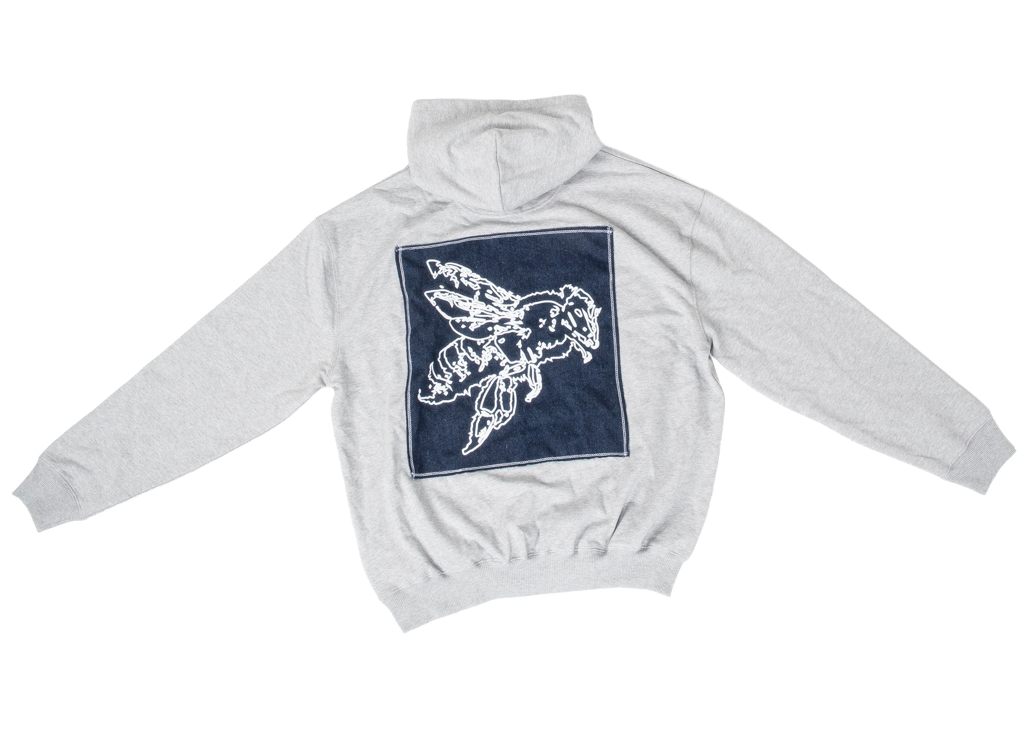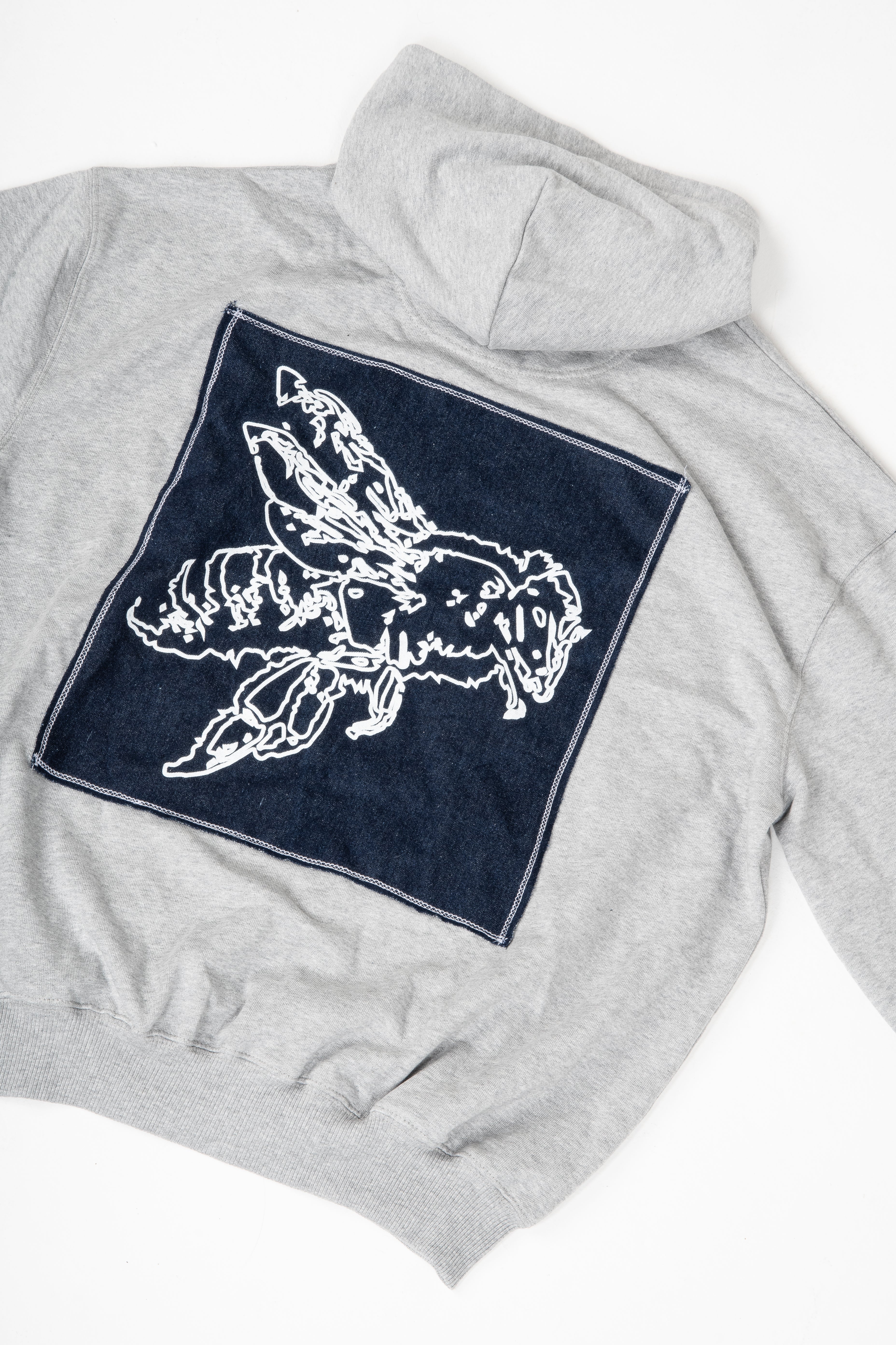 HAND SCREEN PRINTED ONTO NAVY DENIM THEN MADE INOT PATCHWORK FOR FRONT LOGO & BACK COVERING DESIGN