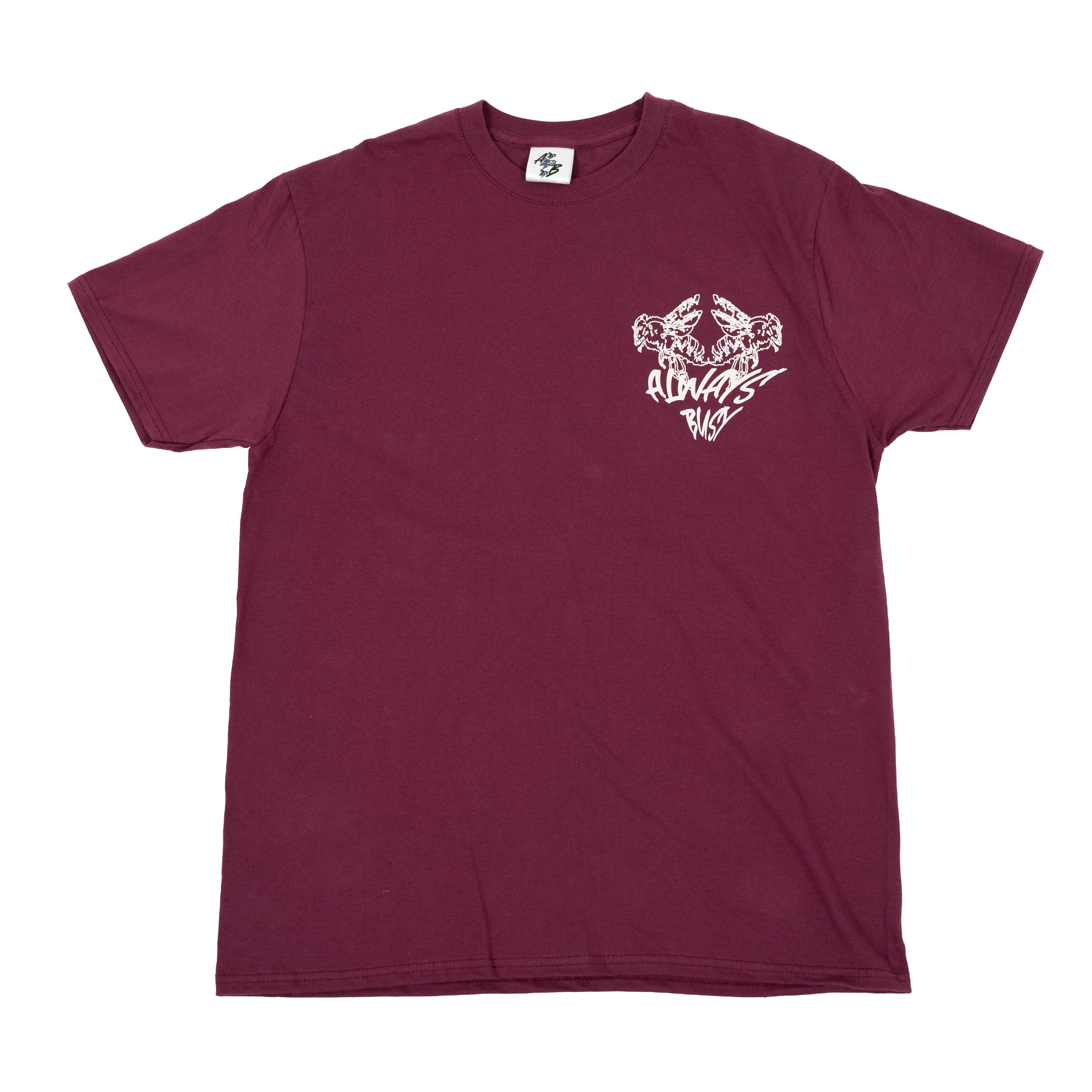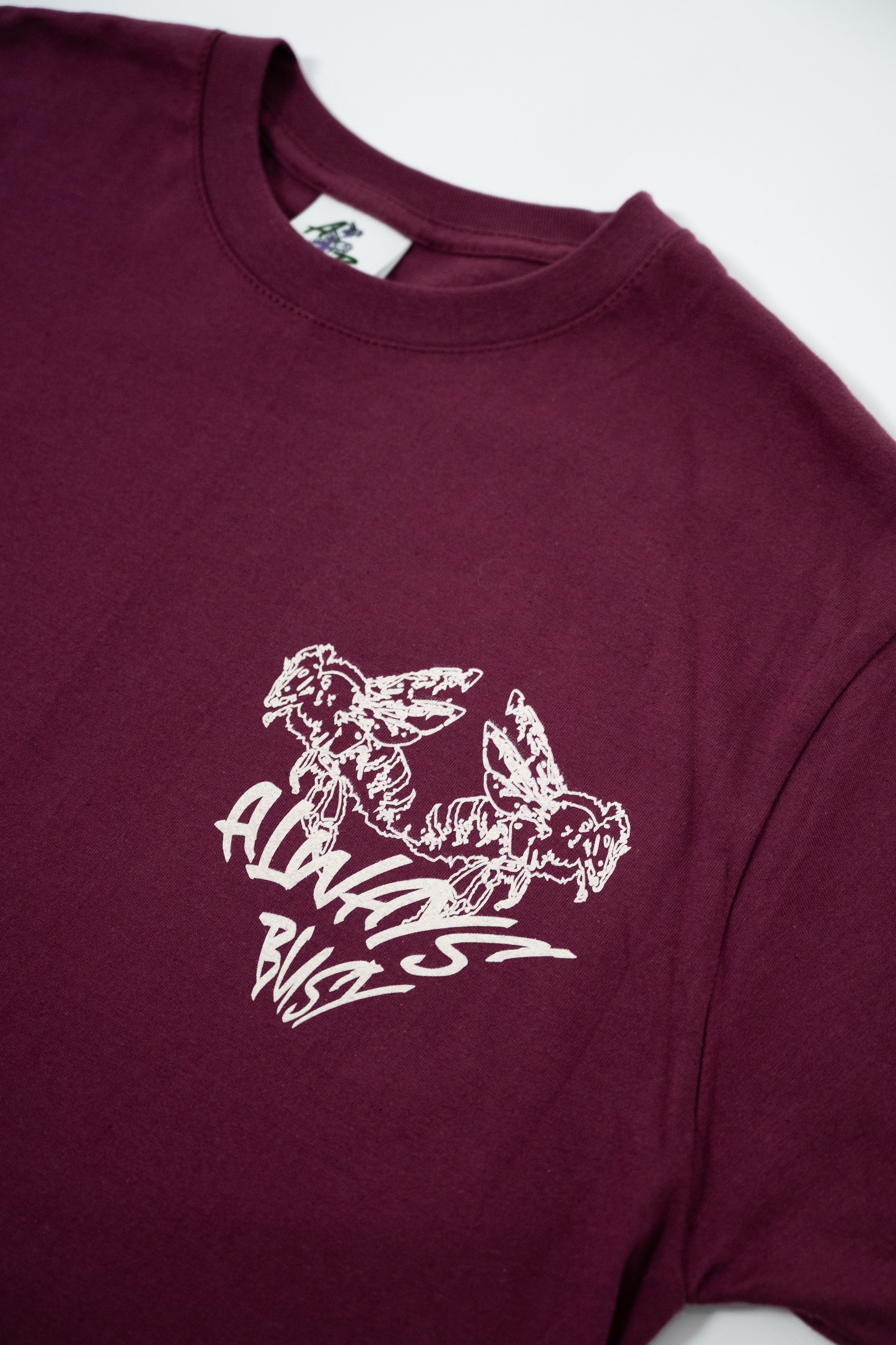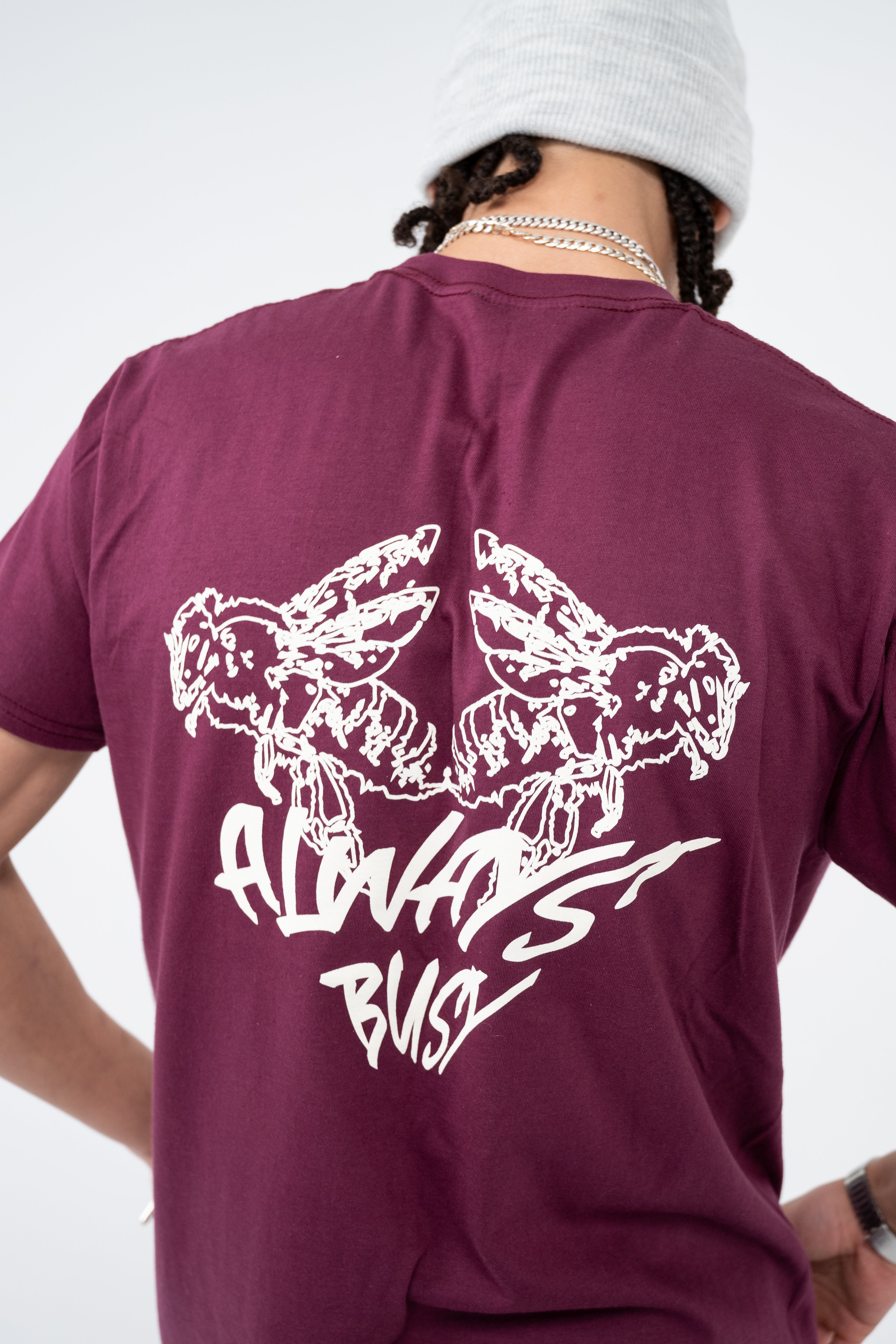 BURGUNDY COLOUR TEE WITH BIEGE MATT SUEDE SCREEN PRINTED DESIGN ON BREAST POCKET & BIG DESIGN ON BACK OF TEE