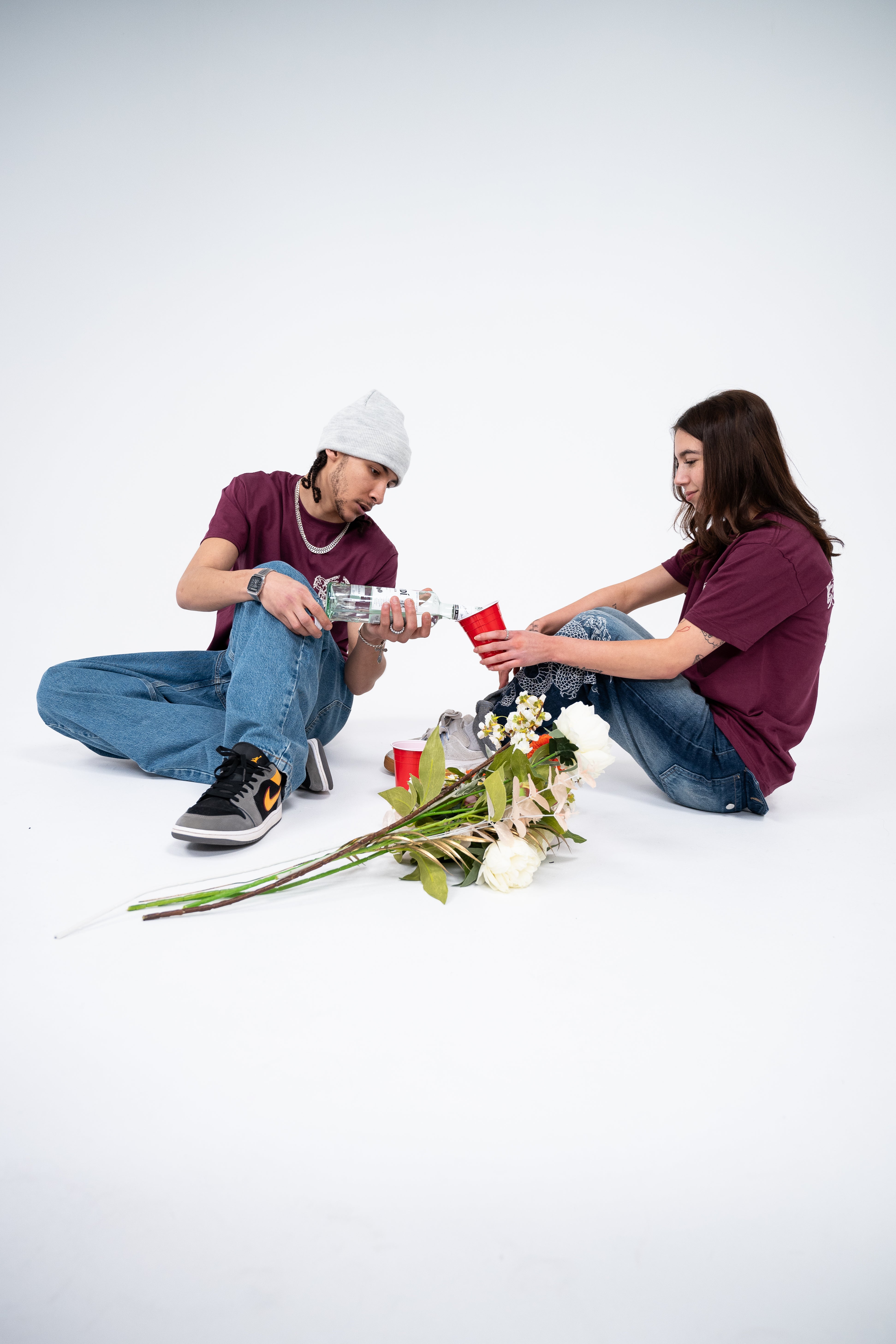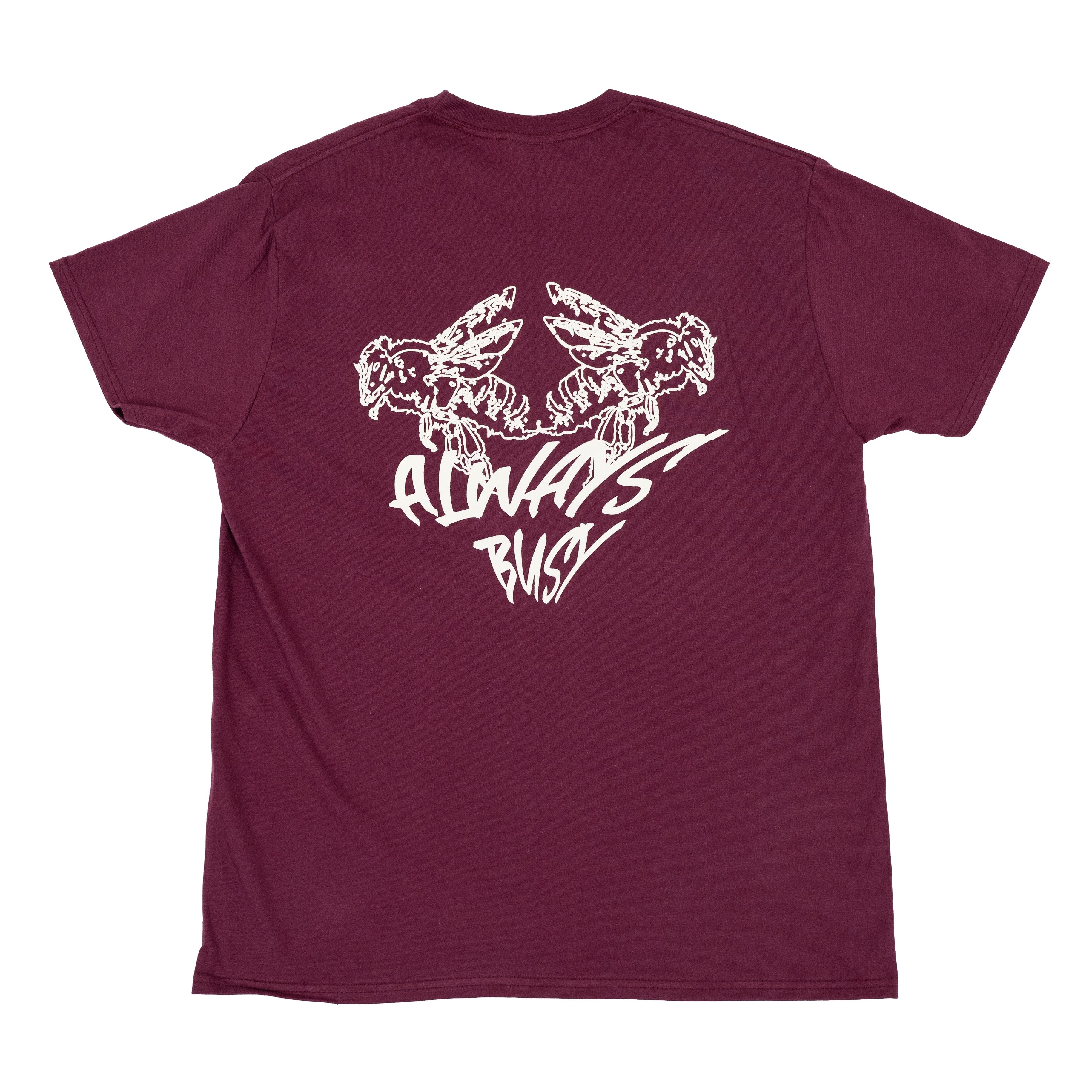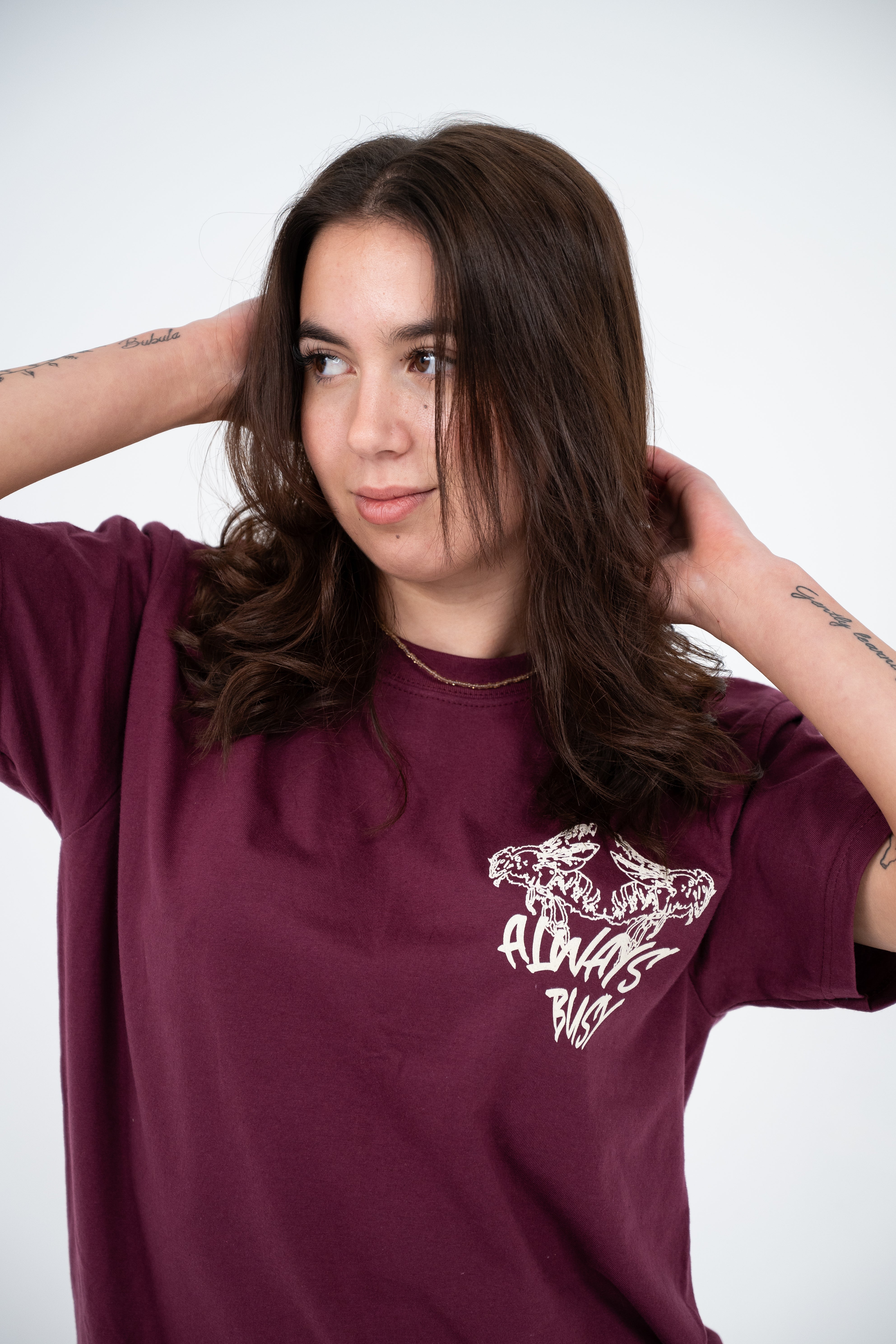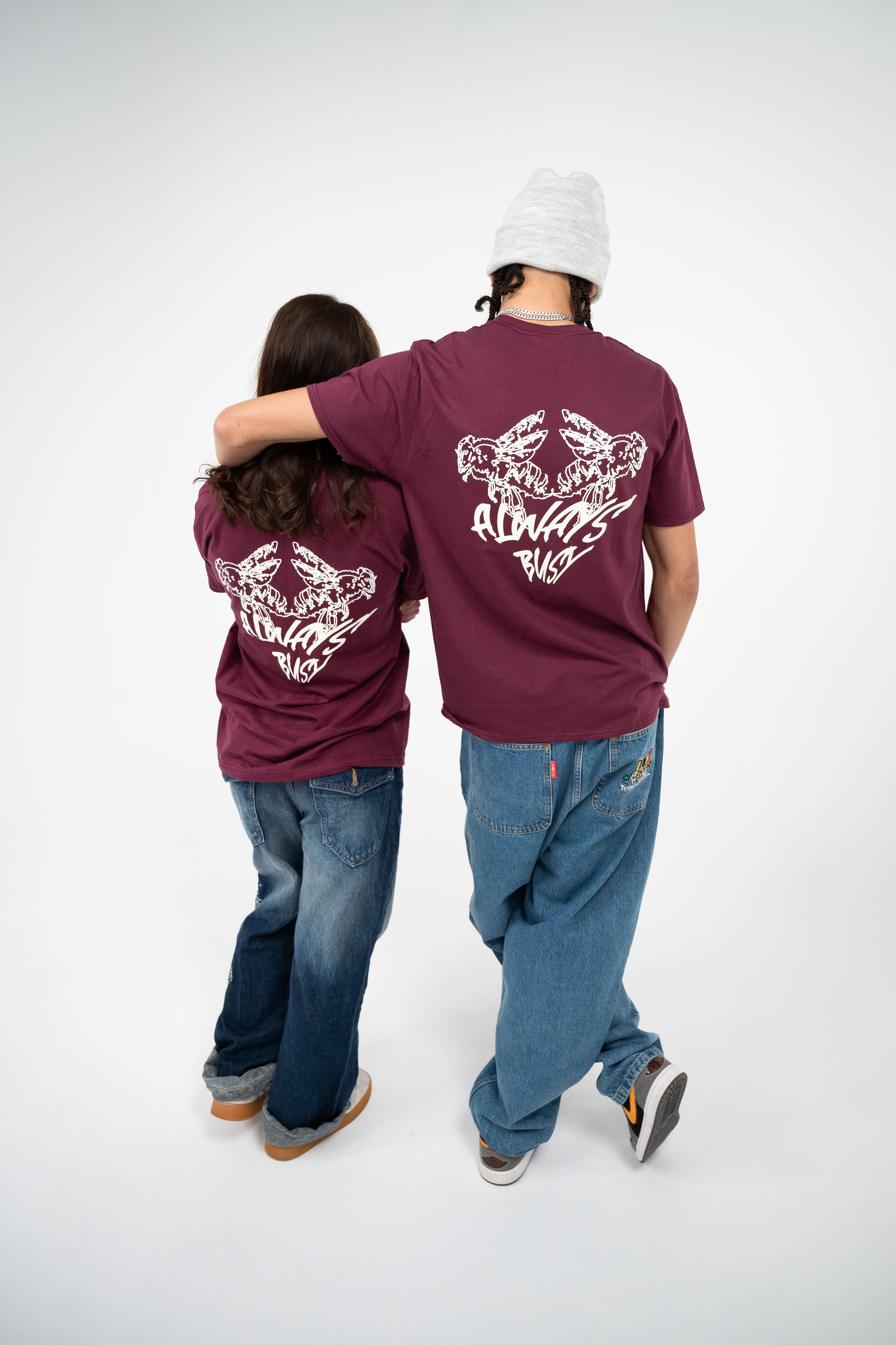 BURGUNDY COLOUR TEE WITH BIEGE MATT SUEDE SCREEN PRINTED DESIGN ON BREAST POCKET & BIG DESIGN ON BACK OF TEE