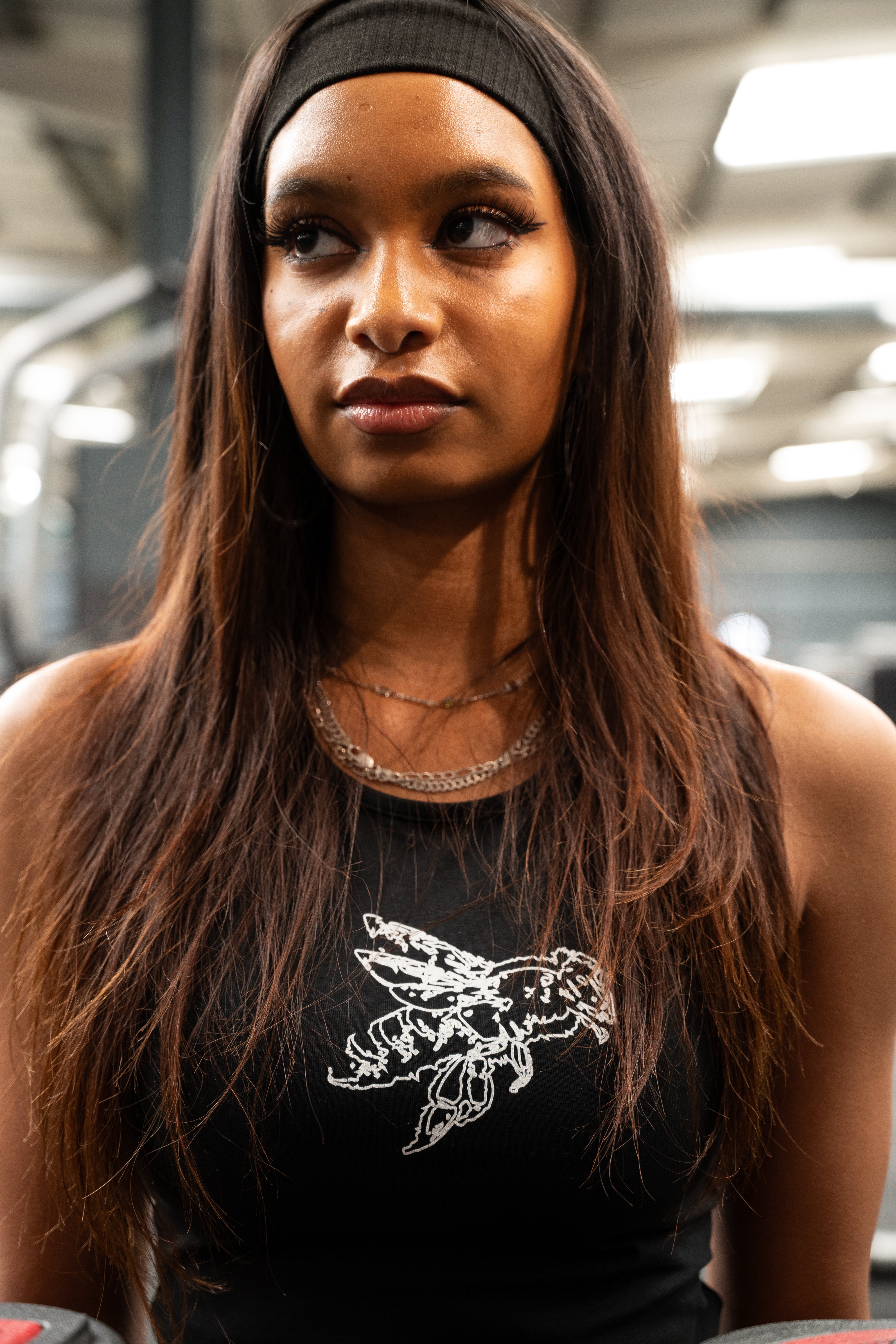 EQUIPPED WITH A DYNAMIC , SPORTY RACERBACK CUT . THIS WOMANS TOP OFFERS A HIGH CREW NECK ON THE FRONT , WHILE THE CUT IS SLIM FIT & THE LENGTH IS KEPT SHORT